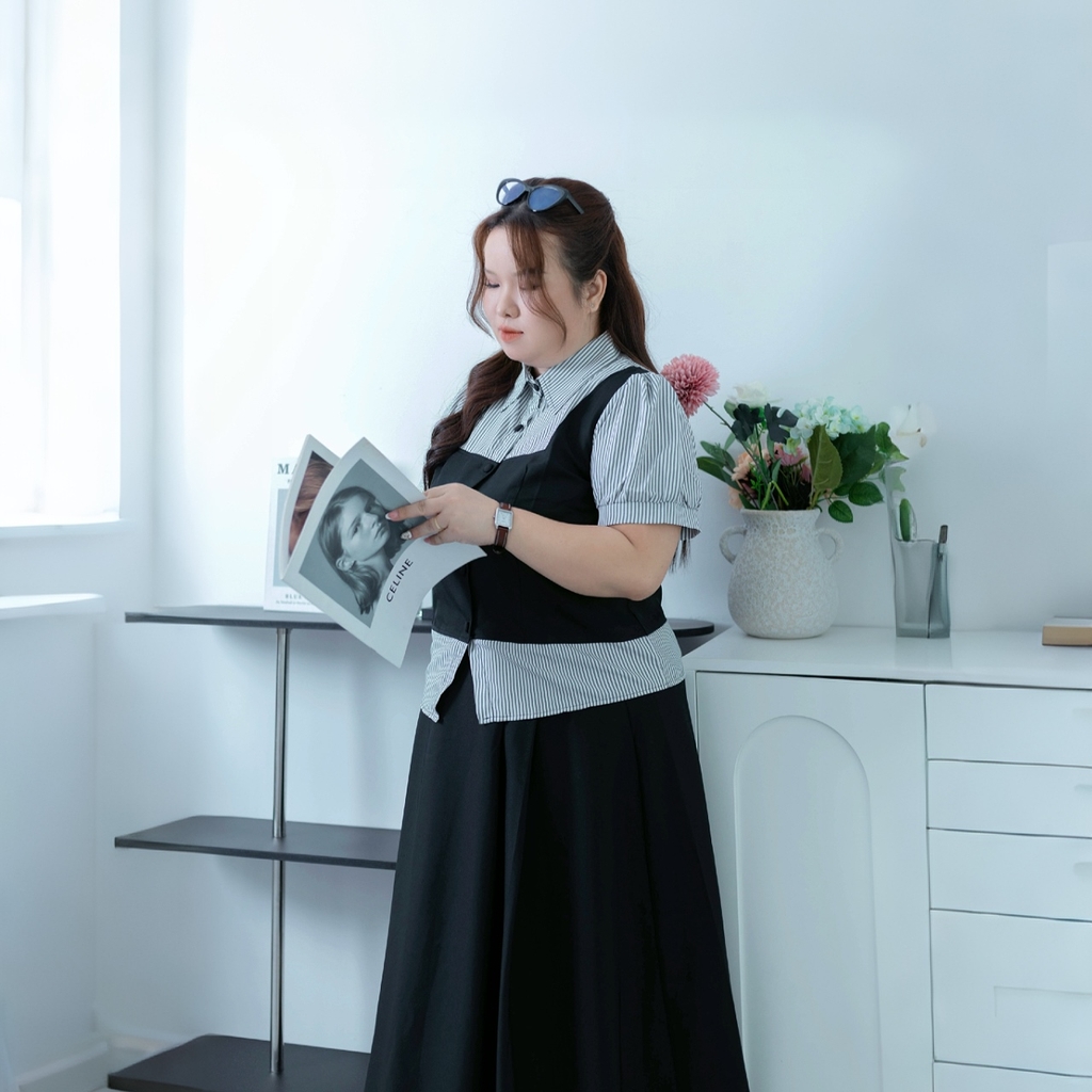 Áo sơ mi sọc phối gilê là thiết kế 2 trong 1, vừa thanh lịch, nữ tính, lại không kém phần trẻ trung, năng động. Phần sơ mi sọc dọc tạo hiệu ứng thon gọn, cao ráo, kết hợp gilê cùng màu làm nổi bật tổng thể và che khuyết điểm phần bụng hiệu quả.