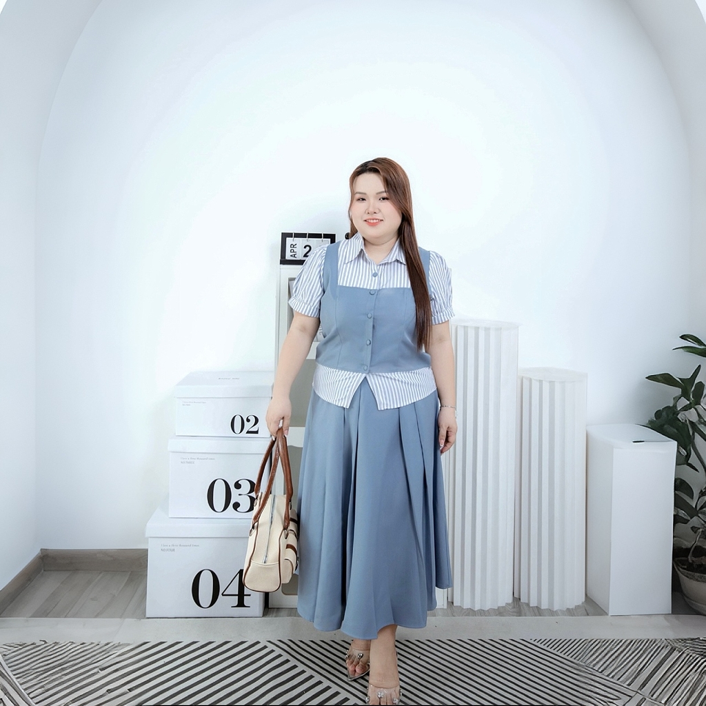 • Thiết kế: Phối sơ mi sọc kèm gilê liền tiện lợi – không cần mặc 2 lớp.