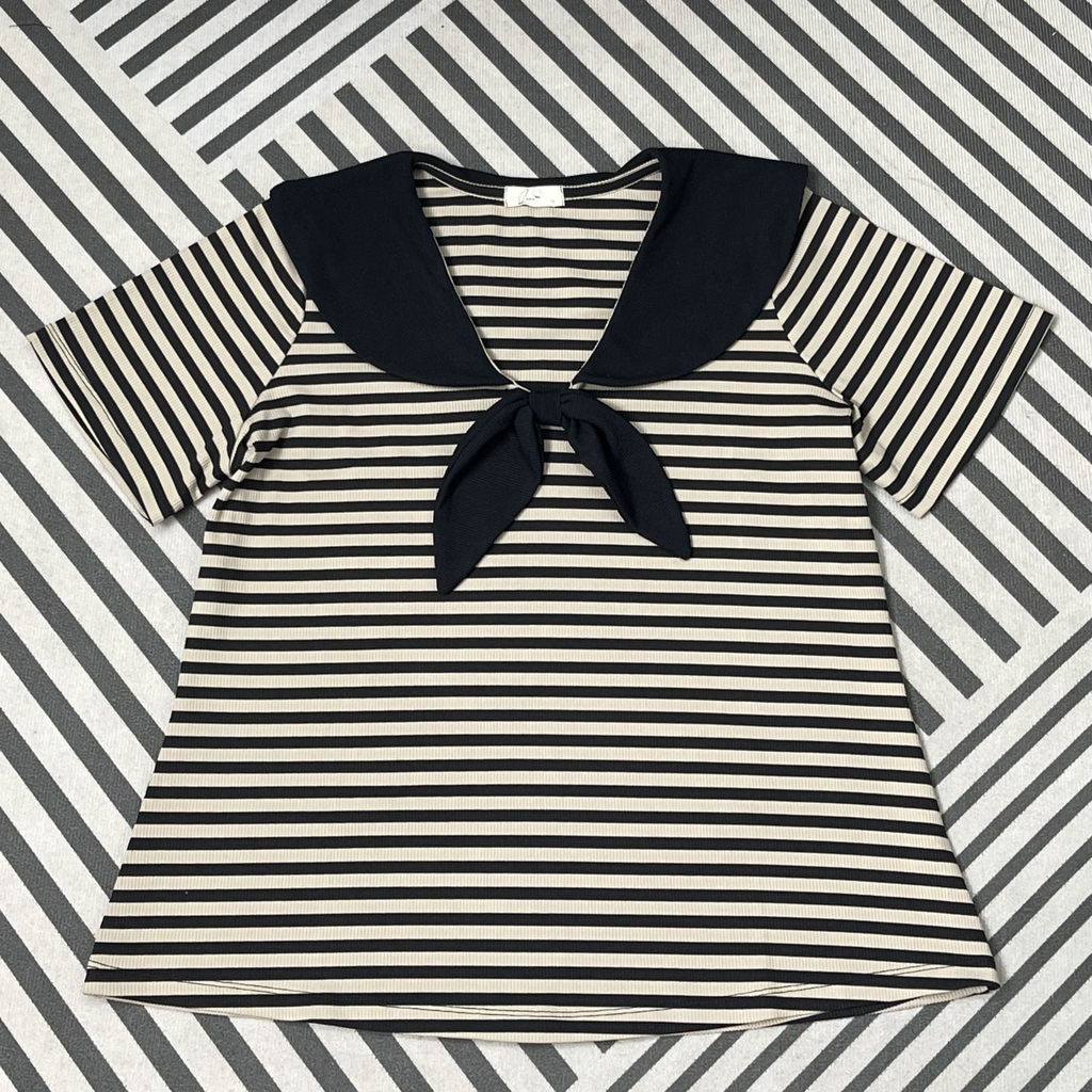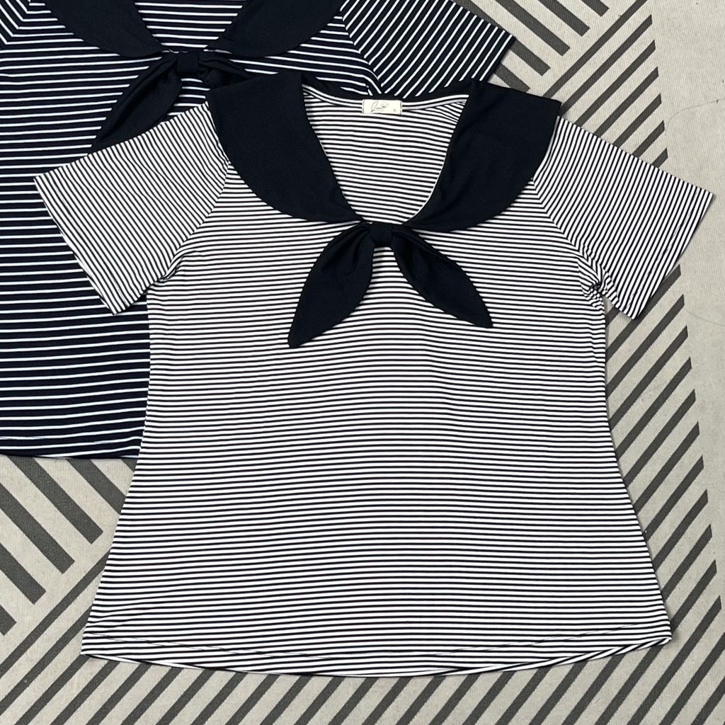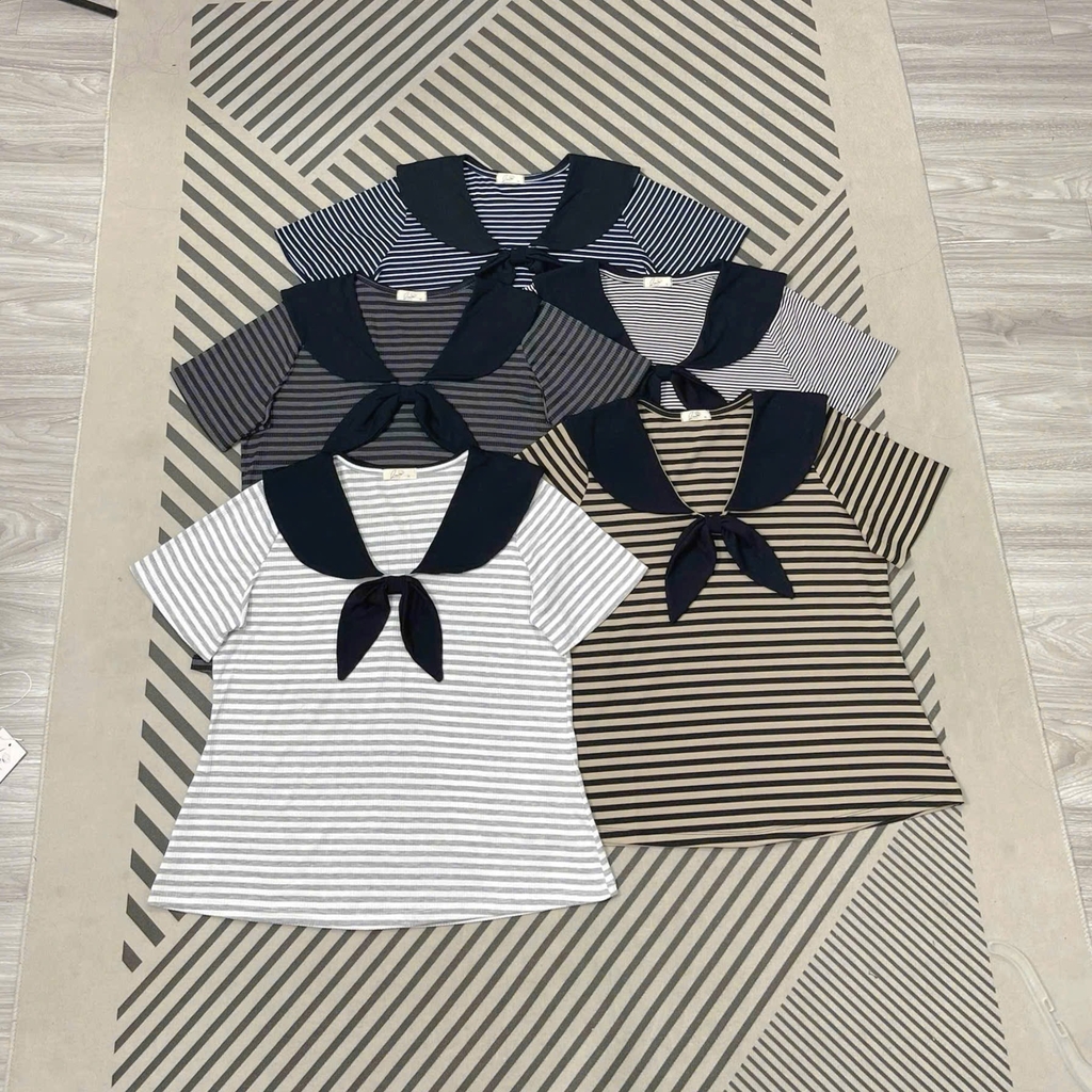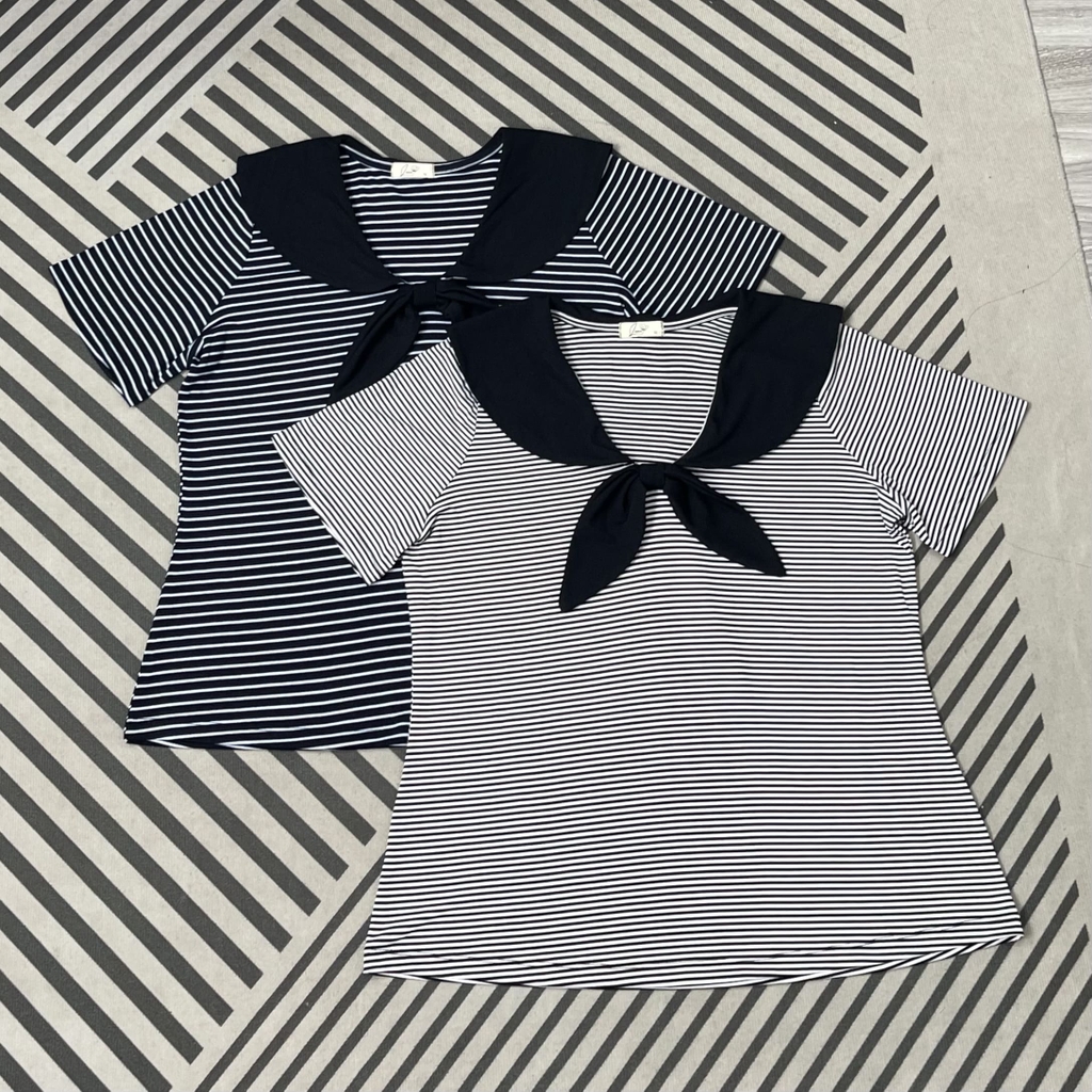 Thiết kế cổ thủy thủ phối nơ tạo điểm nhấn duyên dáng, mang lại cảm giác vừa thanh lịch vừa năng động. Họa tiết sọc ngang sáng da, dễ phối cùng chân váy, quần jean, quần short hay quần suông dài.
