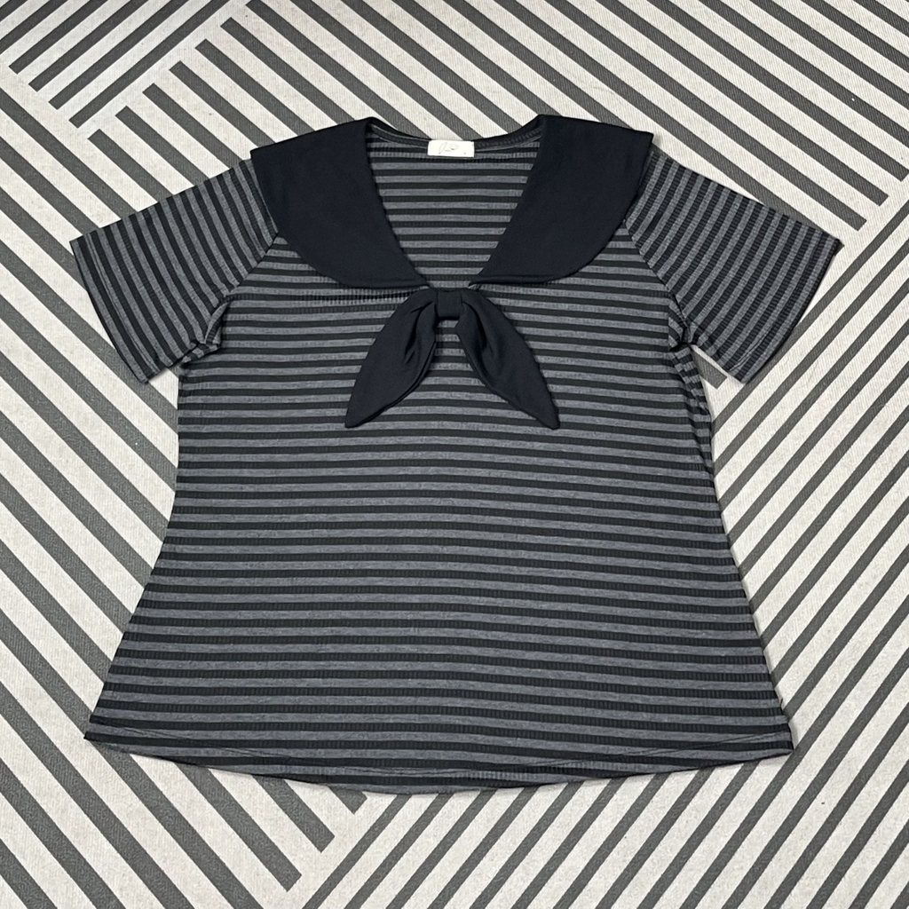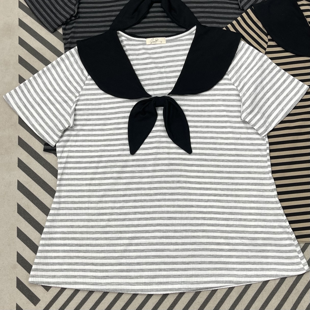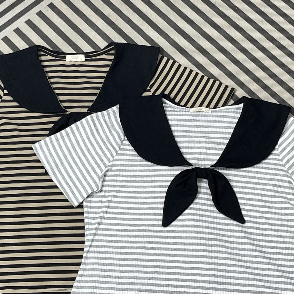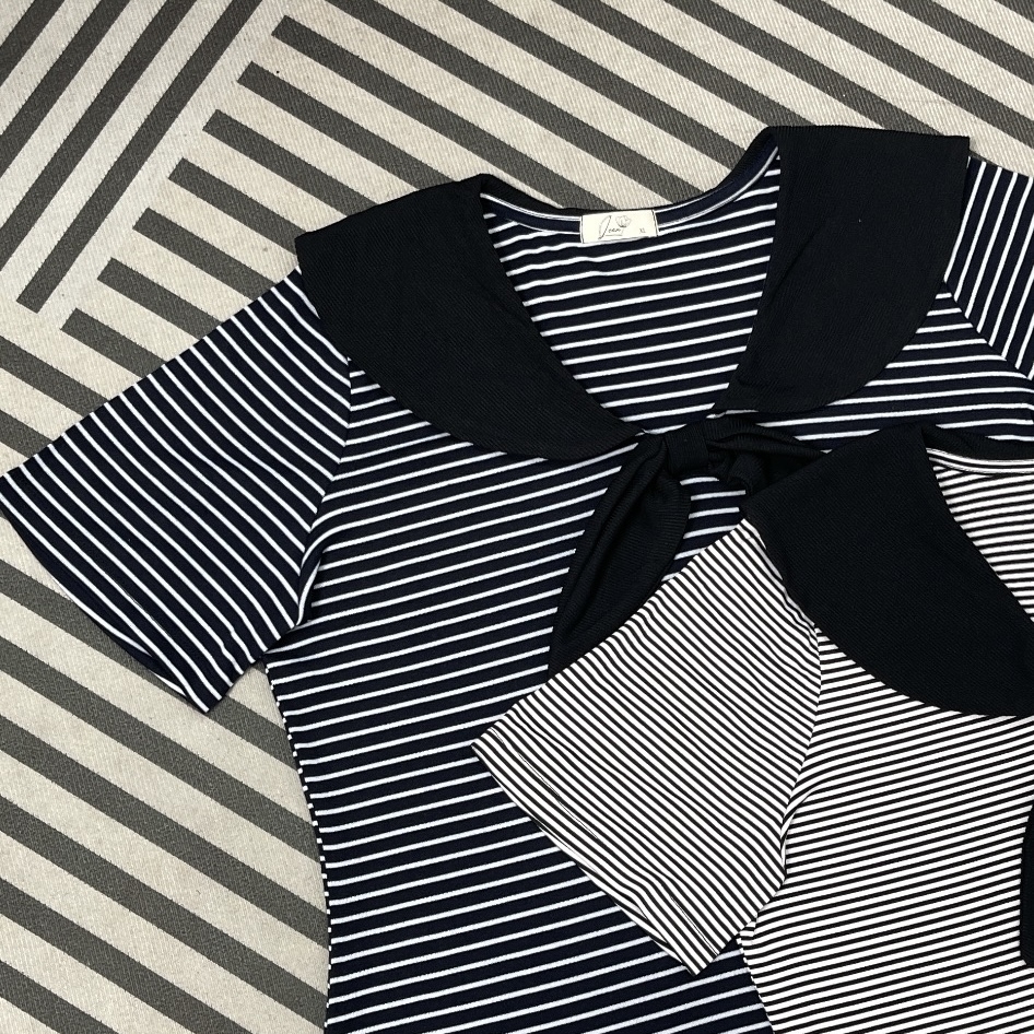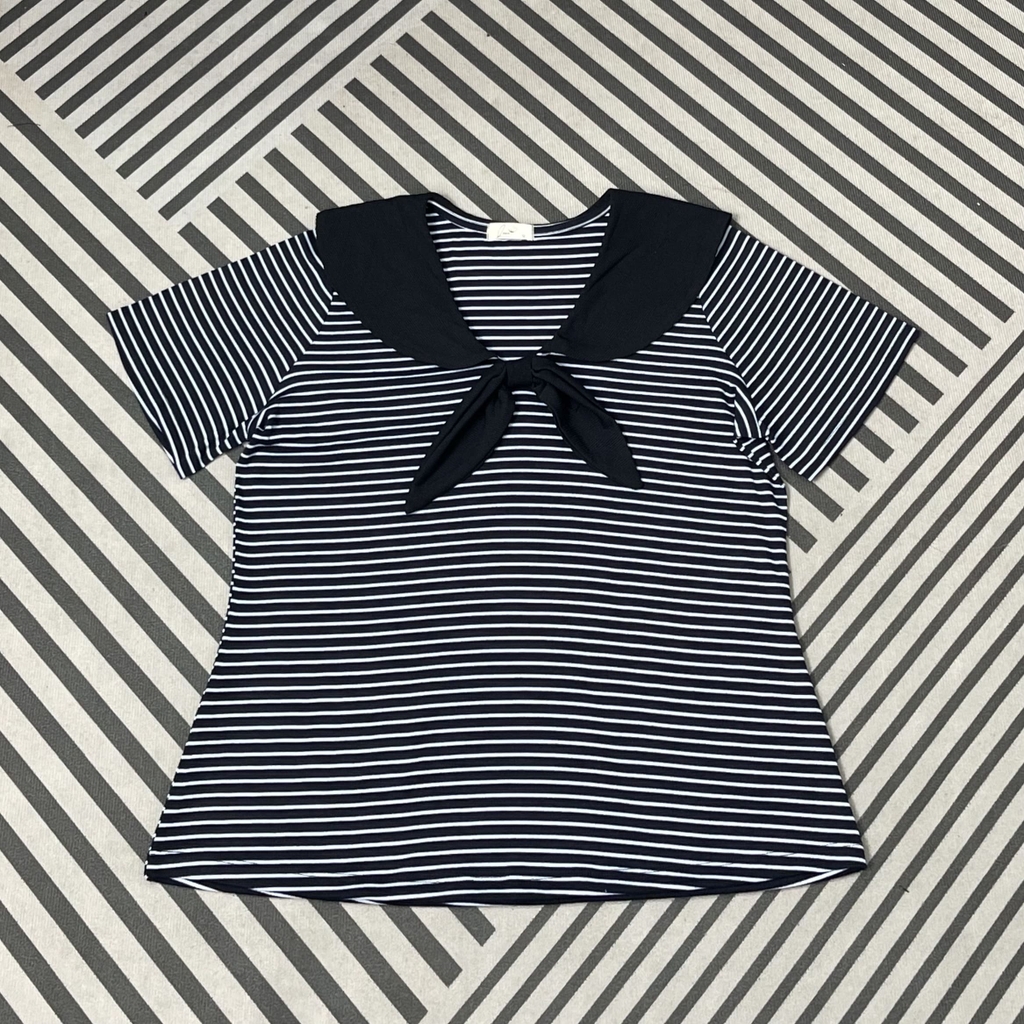 Thiết kế cổ thủy thủ phối nơ tạo điểm nhấn duyên dáng, mang lại cảm giác vừa thanh lịch vừa năng động. Họa tiết sọc ngang sáng da, dễ phối cùng chân váy, quần jean, quần short hay quần suông dài.