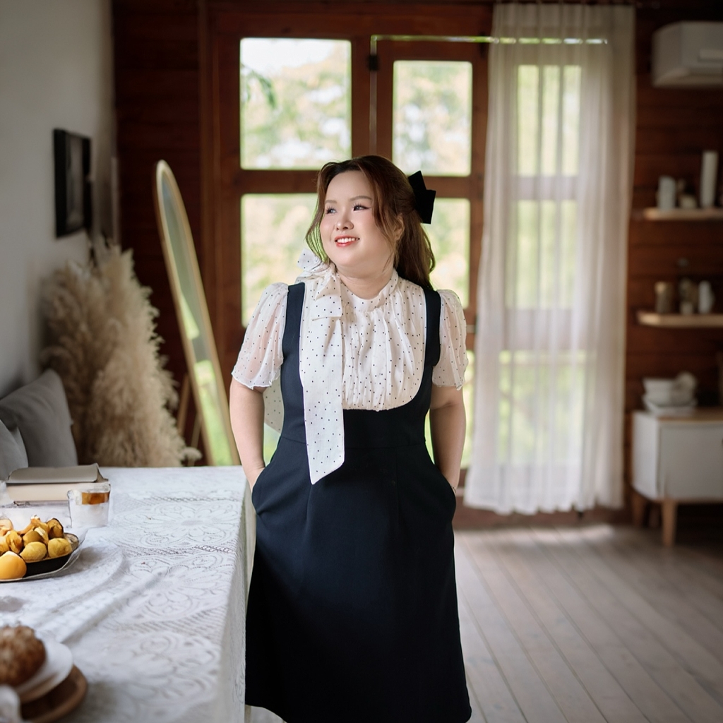 Phối voan tơ chấm bi cổ nơ nhẹ nhàng, tạo điểm nhấn thanh lịch.