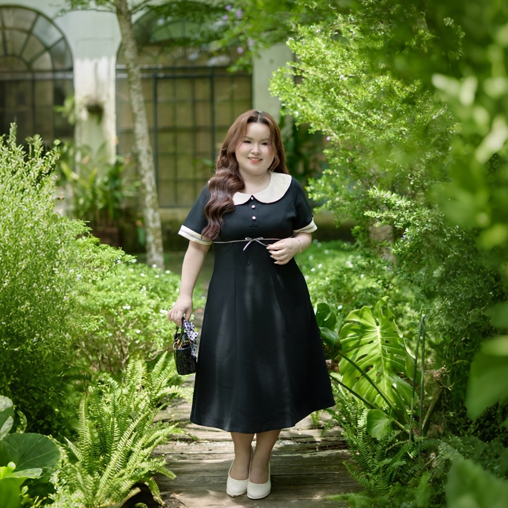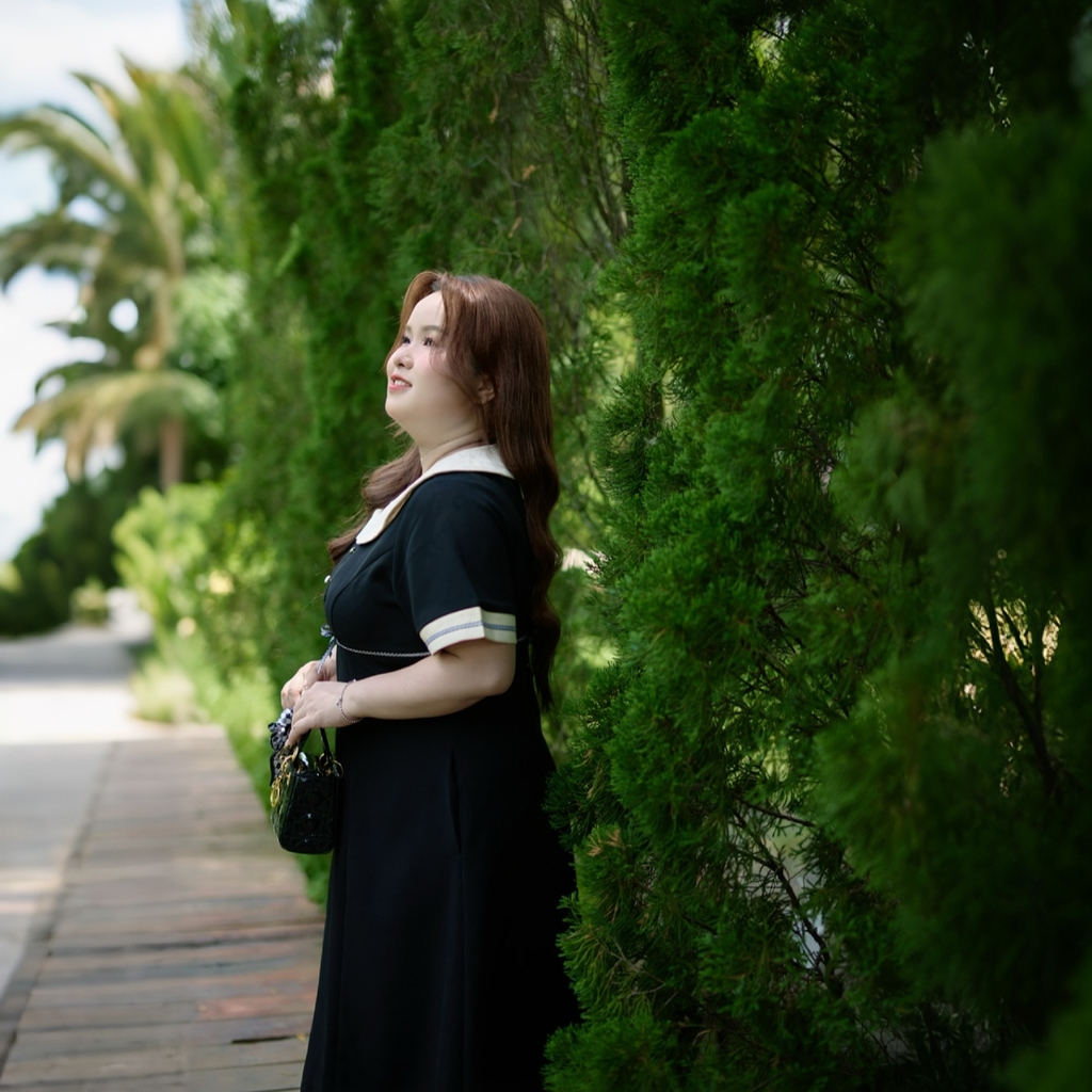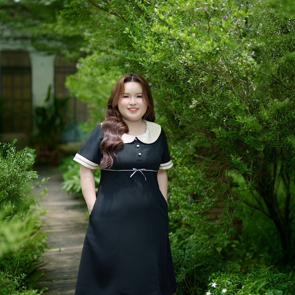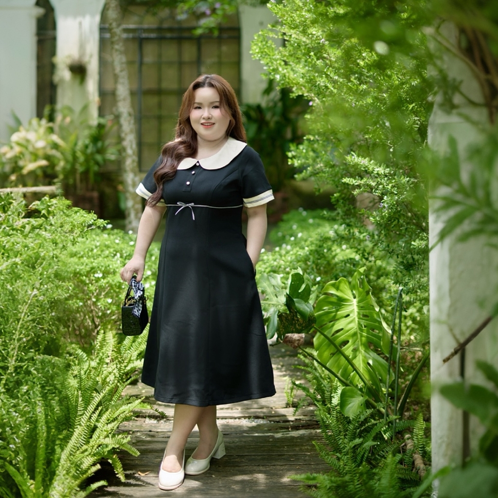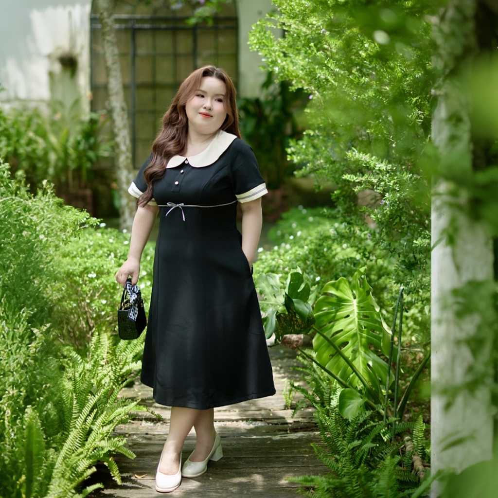 Đầm đen phối kem dáng xòe nhẹ giúp che khuyết điểm tốt, phù hợp cho nàng từ 60-100kg với bảng size đầy đủ L – XL – XXL – 3XL. Thiết kế cổ sen nàng thơ phối viền kem tạo điểm nhấn thanh lịch, nữ tính nhưng vẫn trẻ trung và dễ mặc. Form đầm đứng dáng, giúp cơ thể gọn gàng và tôn vòng eo nhẹ nhàng.