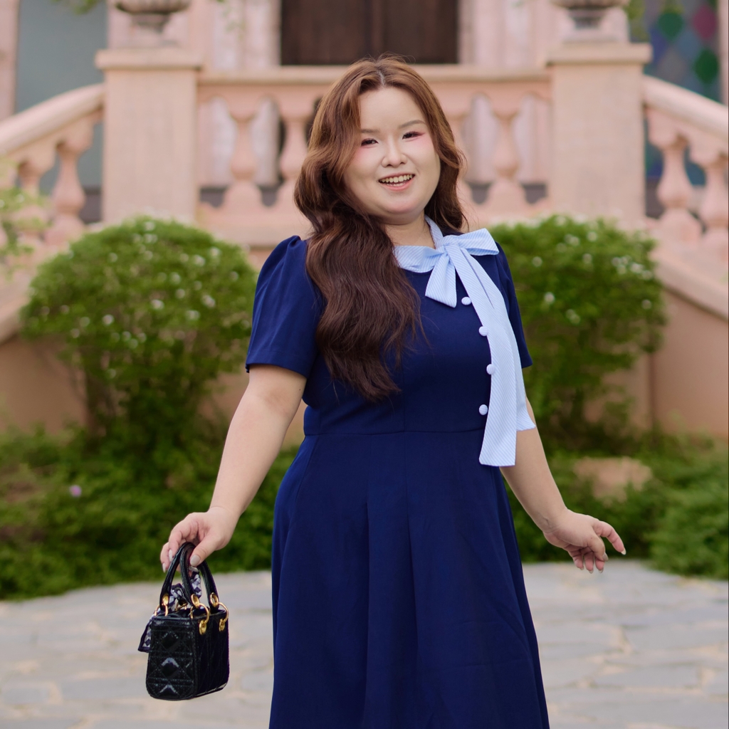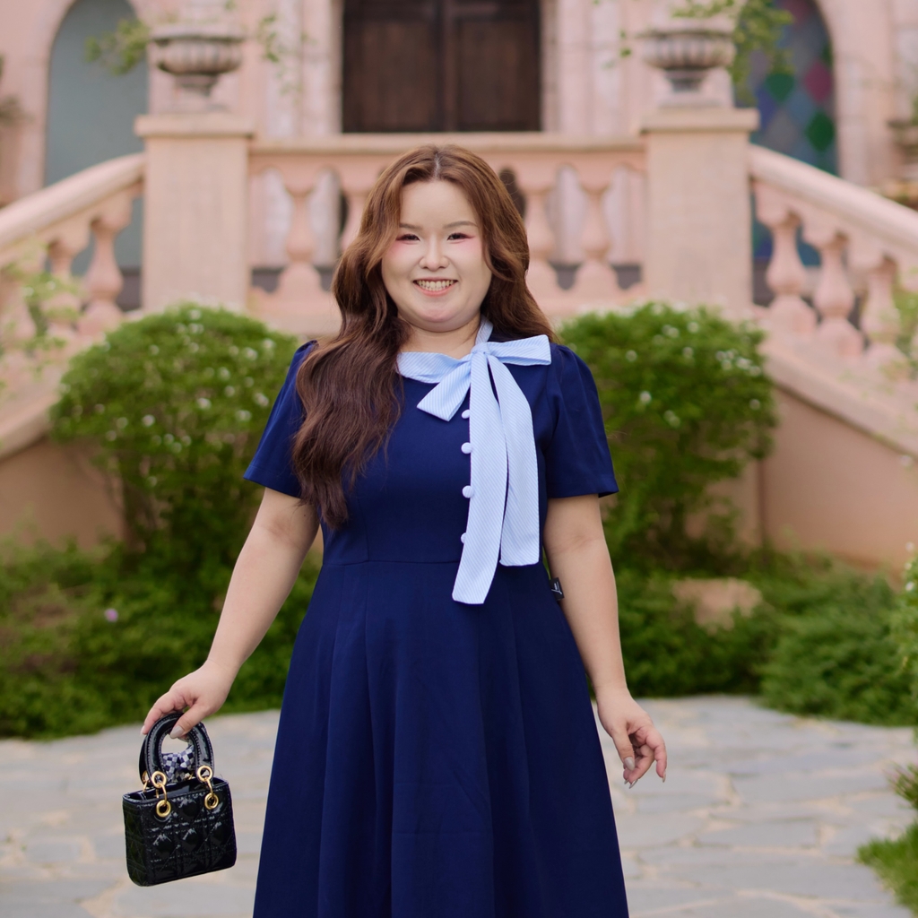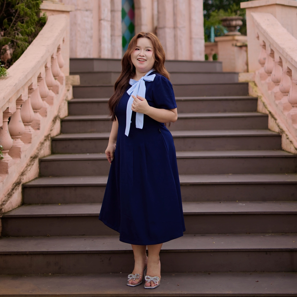 Đầm bigsize dáng xòe thiết kế cổ cột nơ sọc xanh nổi bật, mang phong cách thanh lịch, nữ tính nhưng vẫn trẻ trung và năng động. Chất liệu tuyết mưa 2 lớp dày dặn, co giãn tốt, bề mặt mát mịn, nhẹ và hạn chế nhăn, giúp mặc thoải mái cả ngày và lên form đẹp.
