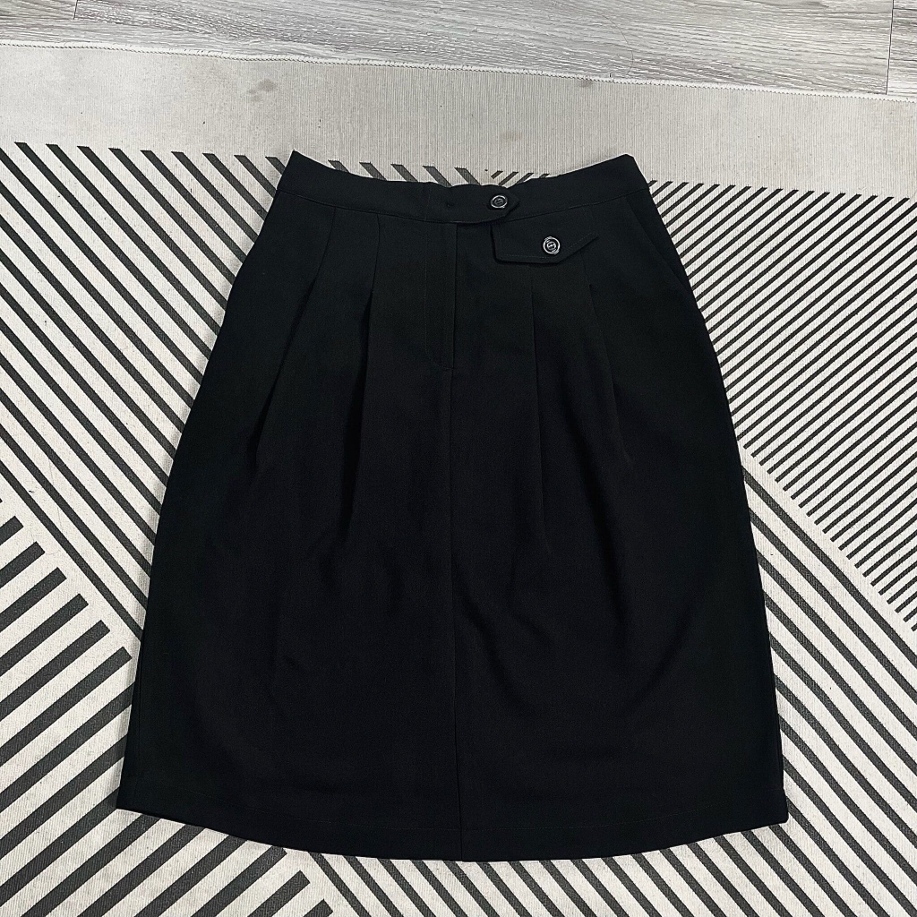 Điểm nhấn của váy là phần lưng chun co giãn phía sau, giúp ôm gọn dáng nhưng vẫn dễ chịu khi di chuyển. Phía trước có chi tiết đai giả thắt lưng kèm nút trang trí, tạo hiệu ứng gọn gàng, thanh lịch mà không làm mất đi sự trẻ trung.