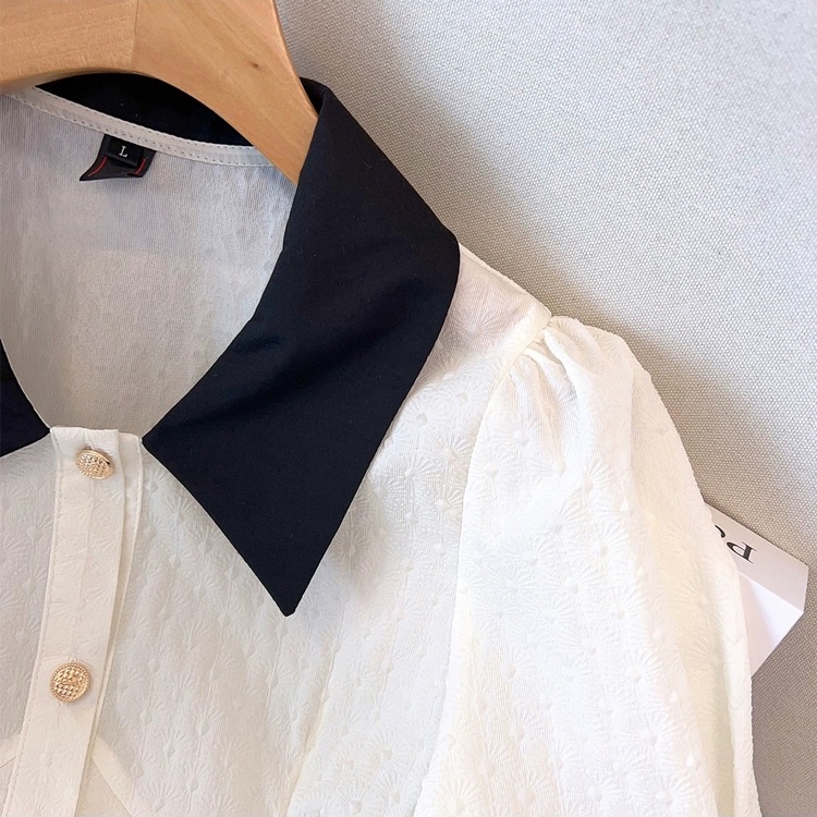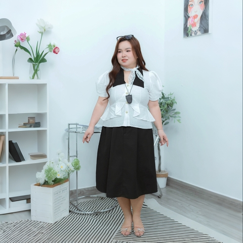 Chiếc áo nổi bật với phần cổ sơ mi phối màu đen nổi bật, kết hợp tay phồng nhẹ tạo nên vẻ thanh lịch và kín đáo. Thiết kế peplum tầng bèo nhẹ ôm eo khéo léo che khuyết điểm, tôn dáng hiệu quả.