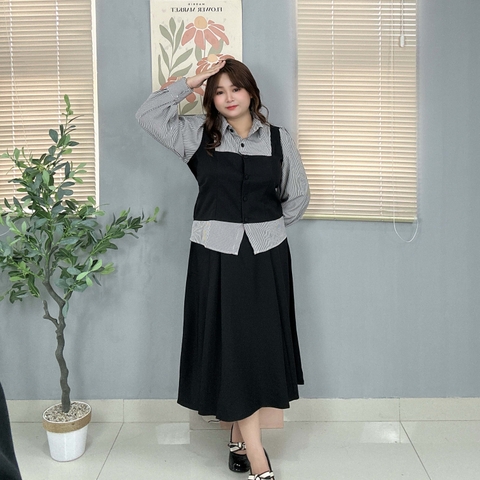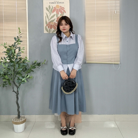 Kiểu dáng: Áo sơ mi tay dài, tay phồng hỗ trợ che bắp tay to tốt. Chân váy xếp ly dáng dài hỗ trợ che bắp chân, phía sau chân váy có lưng thun và 1 bên có dây kéo